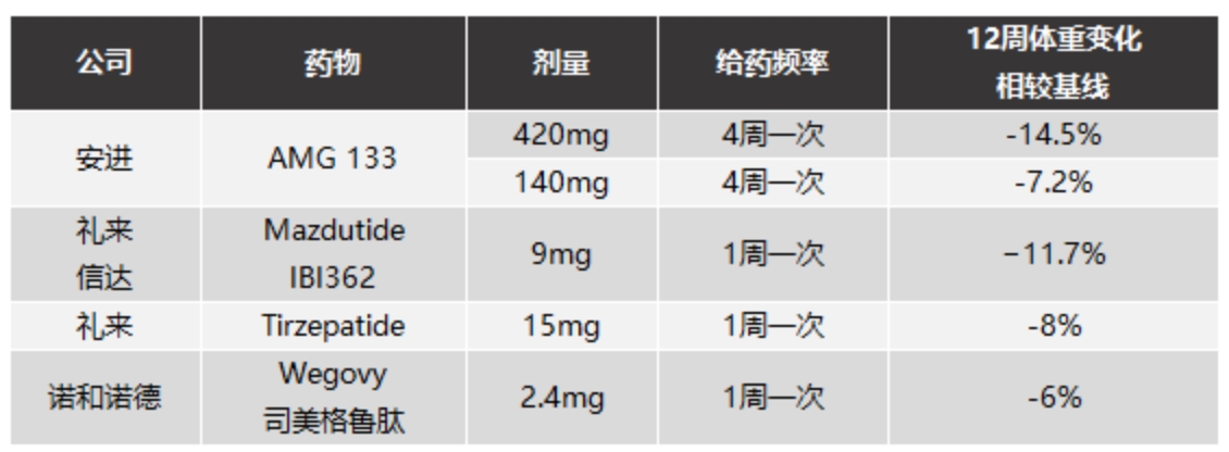 同样作为双靶点药物,GMA106也能同时调节GIPR和GLP-1R信号通路,对肥胖症、非酒精性脂肪肝和糖尿病均有治疗效果。与GMA106相同靶标、相同作用机理的AMG133(安进公司旗下管线)最新临床1期数据显示,使用药物治疗的肥胖患者在经过12周高剂量治疗后,体重与基线相较减少了14.5%,相较于同类产品减重效果更优。