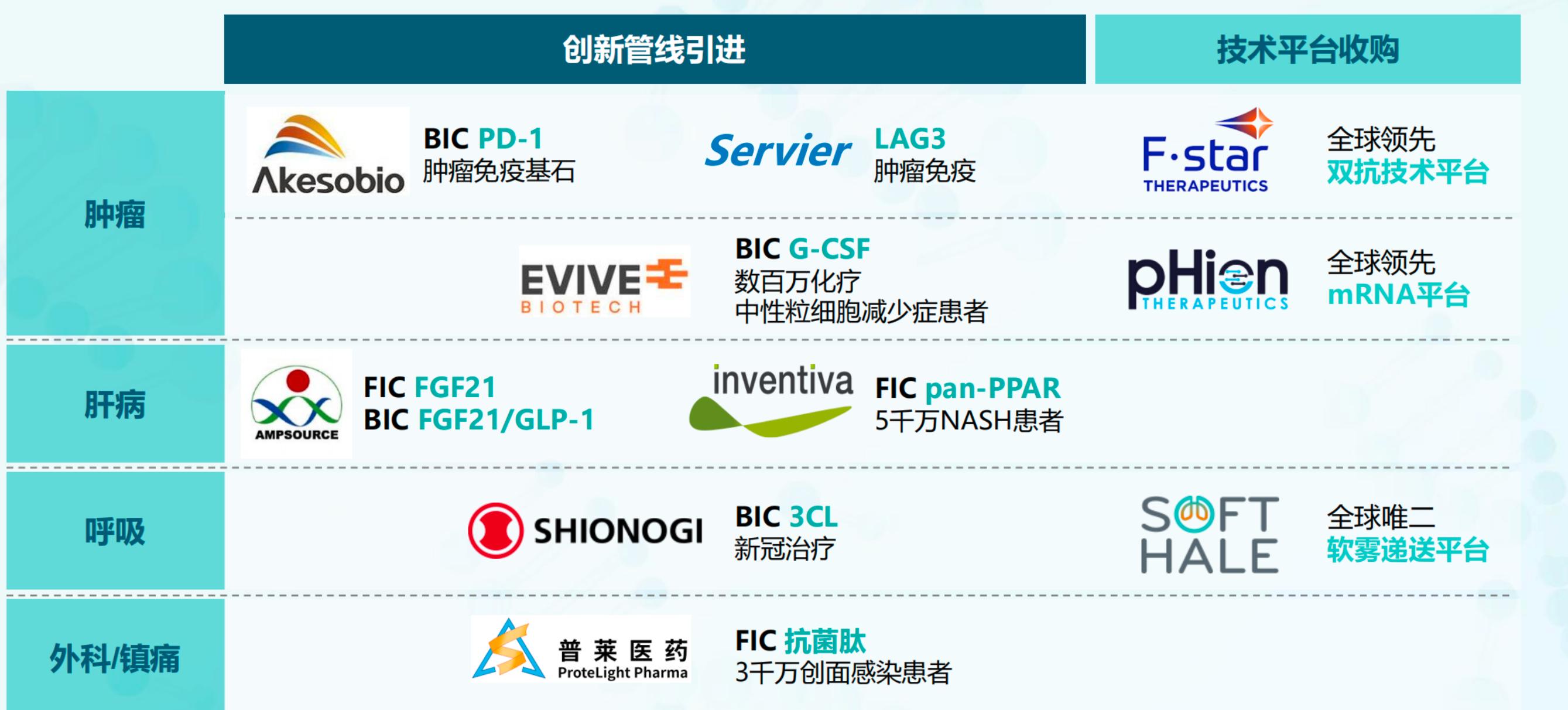 目前,中国生物制药正围绕4大重点治疗领域(肿瘤、肝病、呼吸、外科/镇痛),引进创新管线,并补充相关的技术平台。
