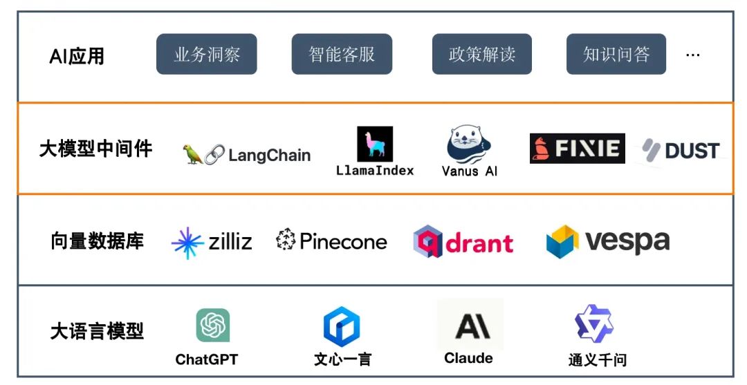 下图给出了企业AI应用的典型软件架构,一共分为大语言模型、向量数据库、大模型中间件以及AI应用四层。