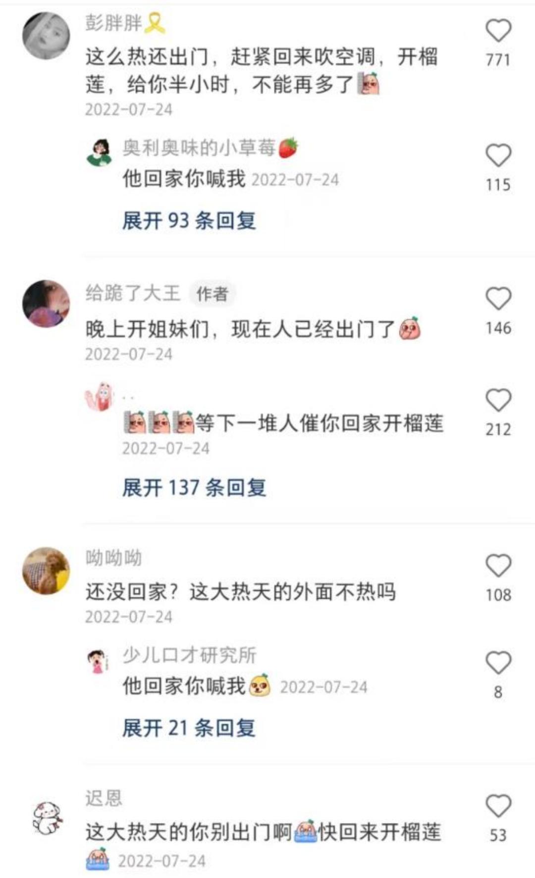 今年夏天,榴莲是当之无愧的网红水果。社交媒体上,“榴莲盲盒”(指买一整个榴莲)、“开榴莲”成为了新的流量密码。每一条关于开榴莲的笔记下都有很多人等后续。
