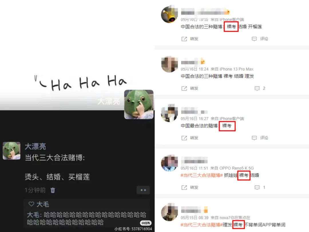 起因是有博主总结当代三大合法“赌博”——买榴莲、理发、结婚,网友们不服气了:我裸考不算吗?倒也算,都主打一个“看运气”。