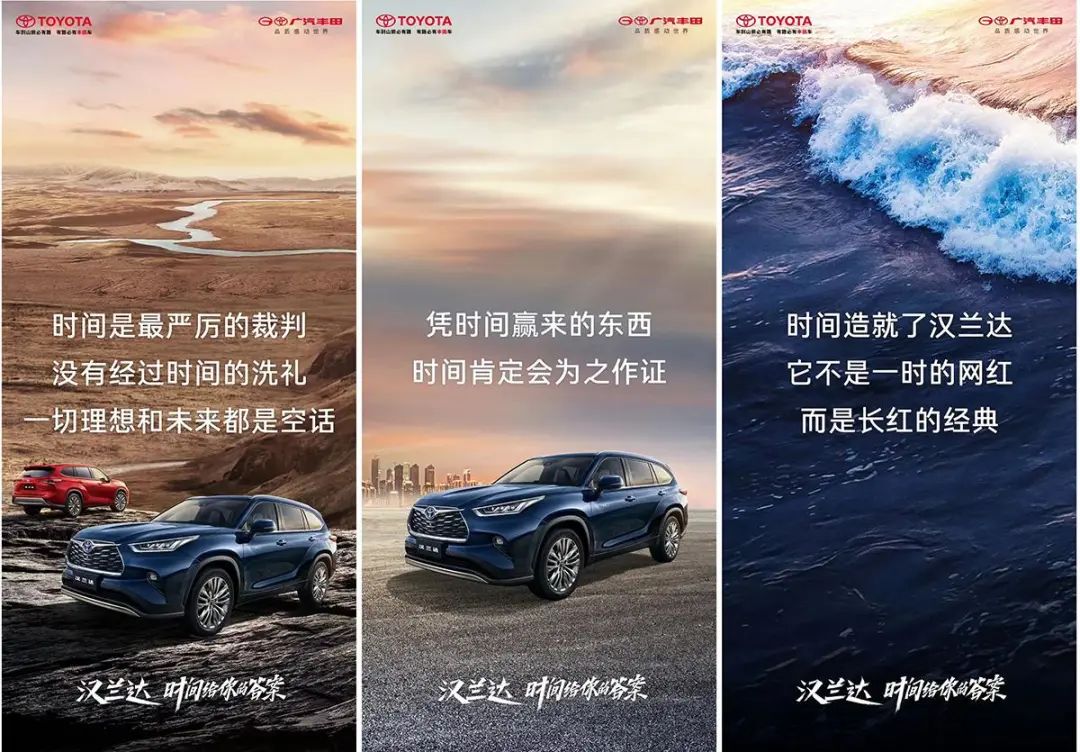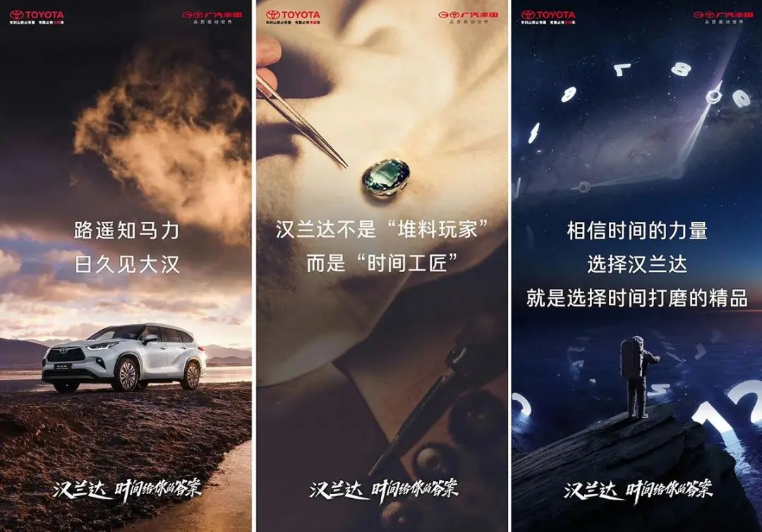 除产品推新,在舆论宣传上汉兰达也整一波了夯实。发布会中汉兰达启用了全新的品牌slogan,“时间给你的答案”。这个口号无可厚非,23年四代产品迭代,国内大七座SUV的标准制定者,同级销量领军者,汉兰达受得起比这更激进热烈的slogan。