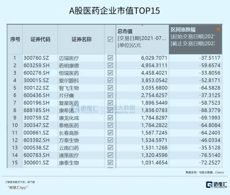 2021年7月1日,A股一共有15家医药企业市值超千亿。其中,天花板是迈瑞医疗,市值逾6000亿元。其次是药明康德、恒瑞医药均逾4000亿元,爱尔眼科、智飞生物均逾3000亿元。