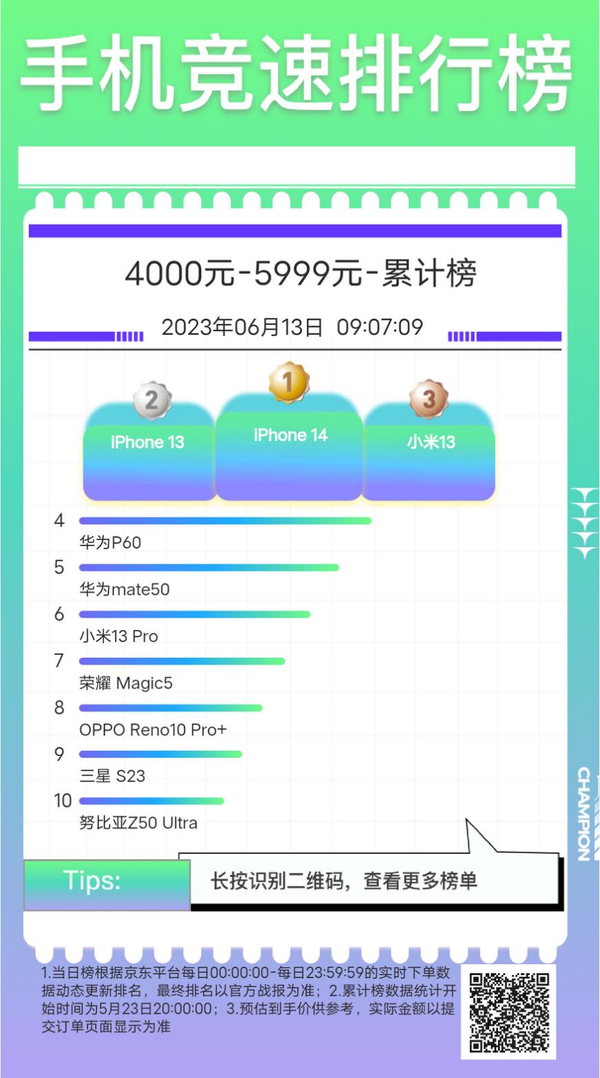 根据京东5月31日-6月12日手机竞速榜,在销量排名前十的手机中,苹果占据了4位,小米占据了3席,oppo和一加占据了2位,荣耀补上了最后一个位置。
