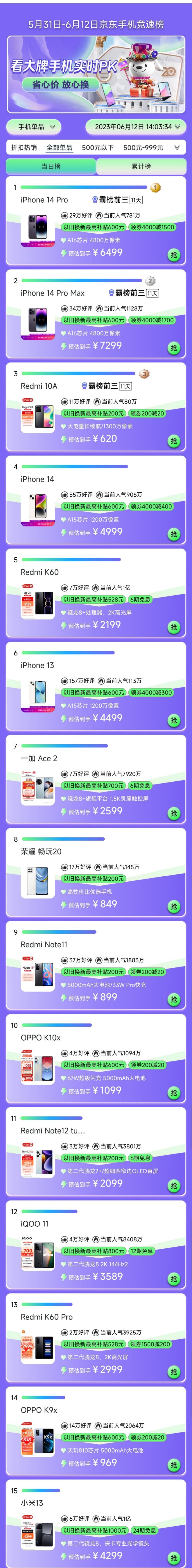 但从价位来看,本次618用一句话总结还是“苹果吃饱饱,国产厂商跟着跑”。榜单前二的iPhone14 Pro和iPhone14 Pro Max售价分别为6499元和7299元,但排名第三的redmi 10A的售价却仅为620元,两者对比价格相差了10倍。整个前十里,安卓厂商以千元机居多,唯二的两款中端机型则是小米荣耀——Redmi K60和一加 Ace 2。