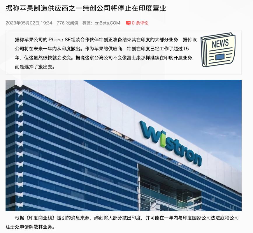 此前纬创为了顺应苹果的战略,把业务重心从中国大陆转移到了印度