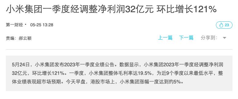 要知道,小米整个集团在 2023 年第一季度的经调净利润是 32 亿元。