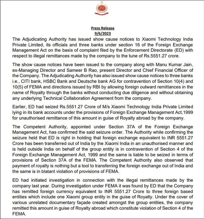 所以印度执法局向小米公司、汇丰银行、德意志银行、花旗银行,发出通知,正式对小米提起指控,说要没收小米被印度政府冻结的一笔资金。