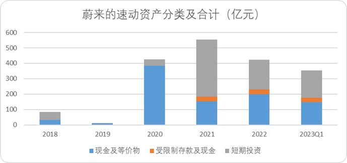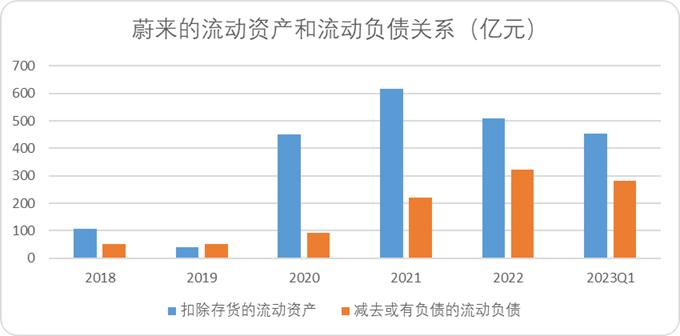 我们还是用2022年报数据作为参照系——毕竟2023Q1对于蔚来而言太惨了点:2022年度亏损144亿元,经计算的流动负债-流动负债的安全垫在190亿元左右。
