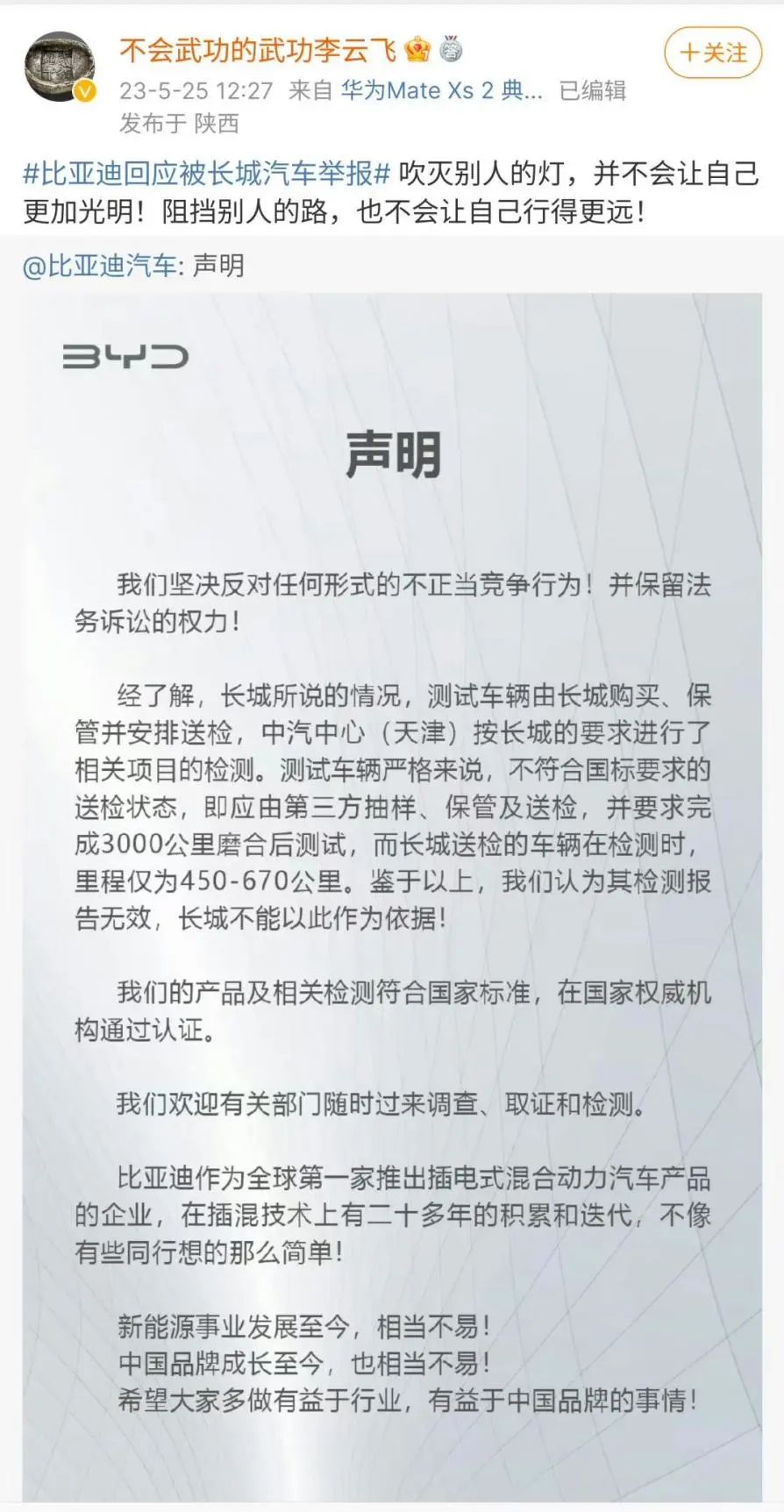 比亚迪回应举报的声明。(图/微博@不会武功的武功李云飞)