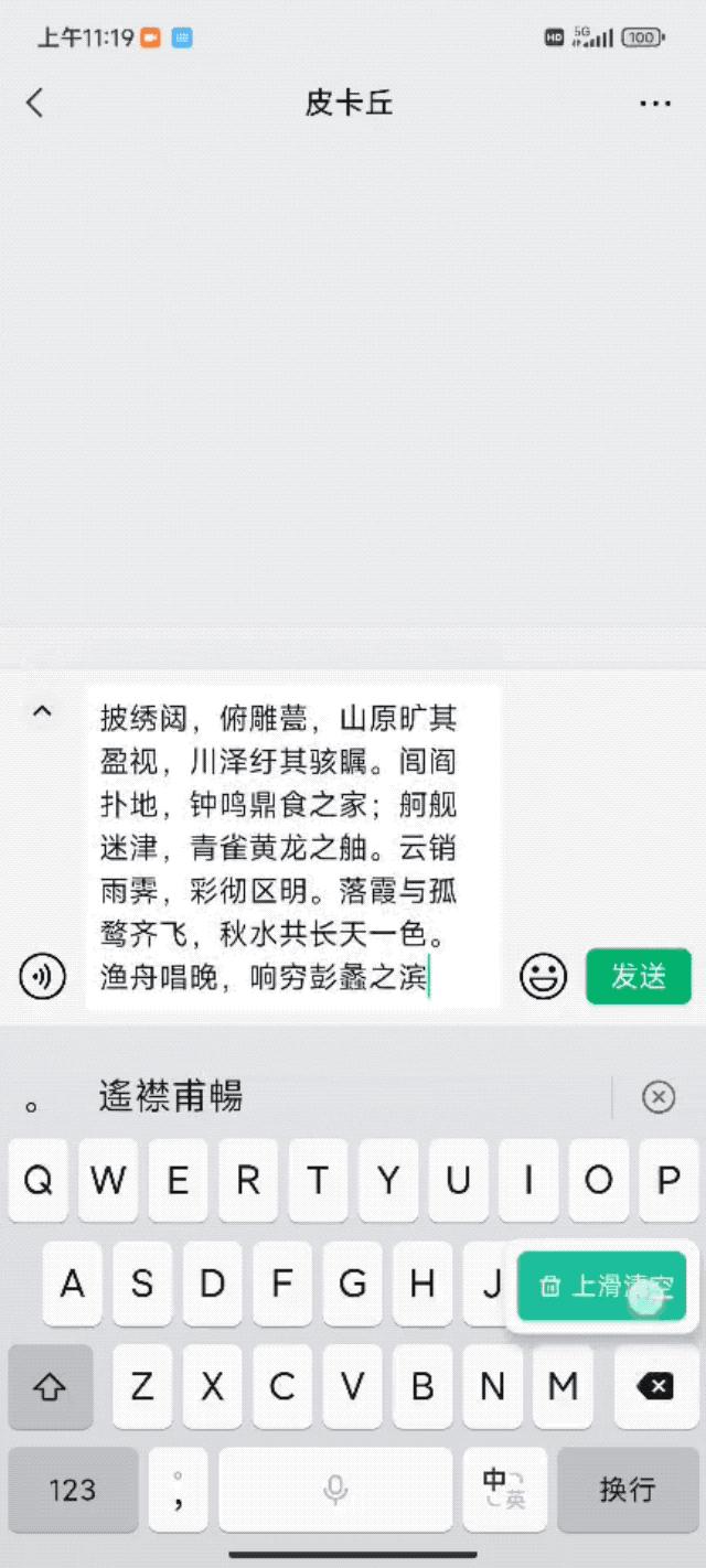 写完一大段话后又不想发送了?不用长按删除键等待文字删除,上滑就够了。