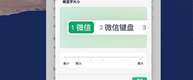 在设置中,我们可以修改候选框的大小。像我这种使用高分辨率屏幕,又把屏幕分辨率调到最高的情况,就会导致图标变小,虽然一般来说不会有什么影响,但文字输入时确实会麻烦一些,可以放大的微信键盘就解决了这个问题。