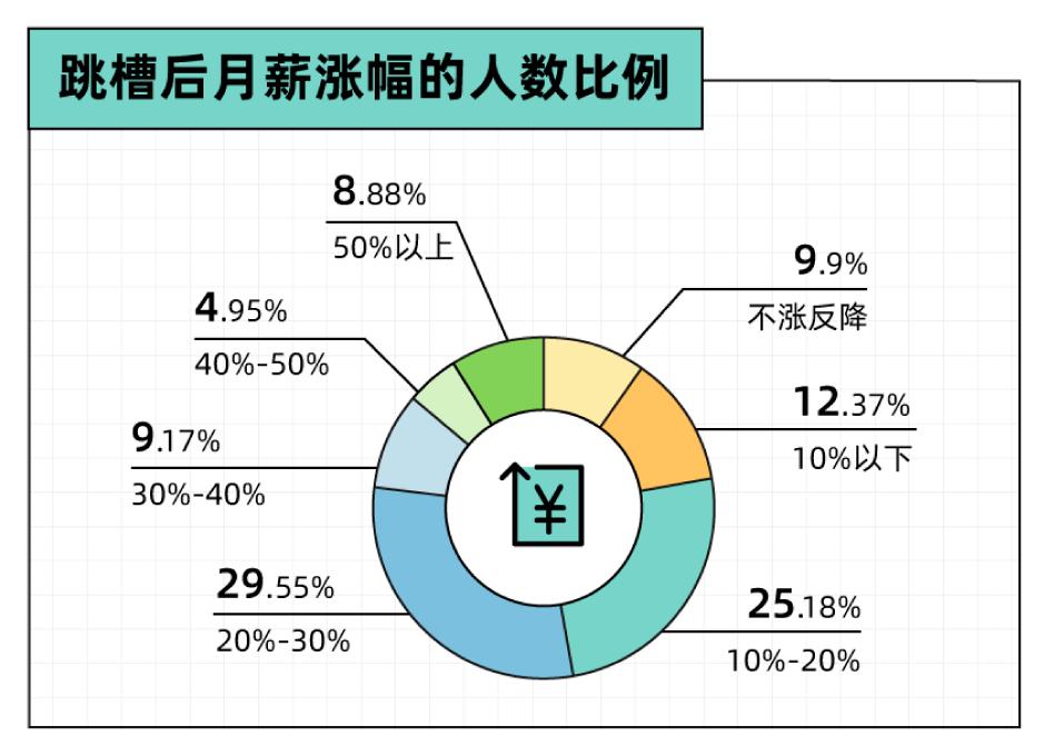 根据36氪发布的《2022年轻人跳槽报告》,超过半数的受访者在跳槽后实现了20%的涨薪。基于此,网上甚至有人总结:跳槽涨薪30%是基准值,涨薪50%才是好的跳槽方式,涨薪80%是力争值,是对上一段工作经历的回报。