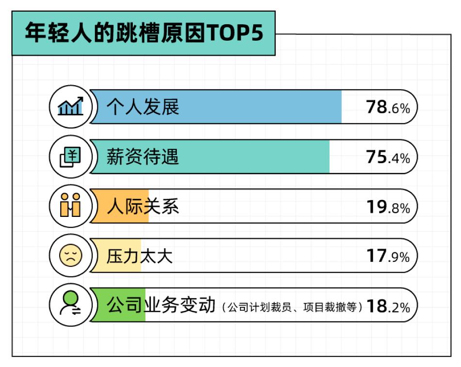 谈及跳槽的原因,超过70%的受访者是为了更好的个人发展和薪资待遇。此外分别有19.8%和17.9%的人是为了调节人际关系和工作压力而想要换工作。