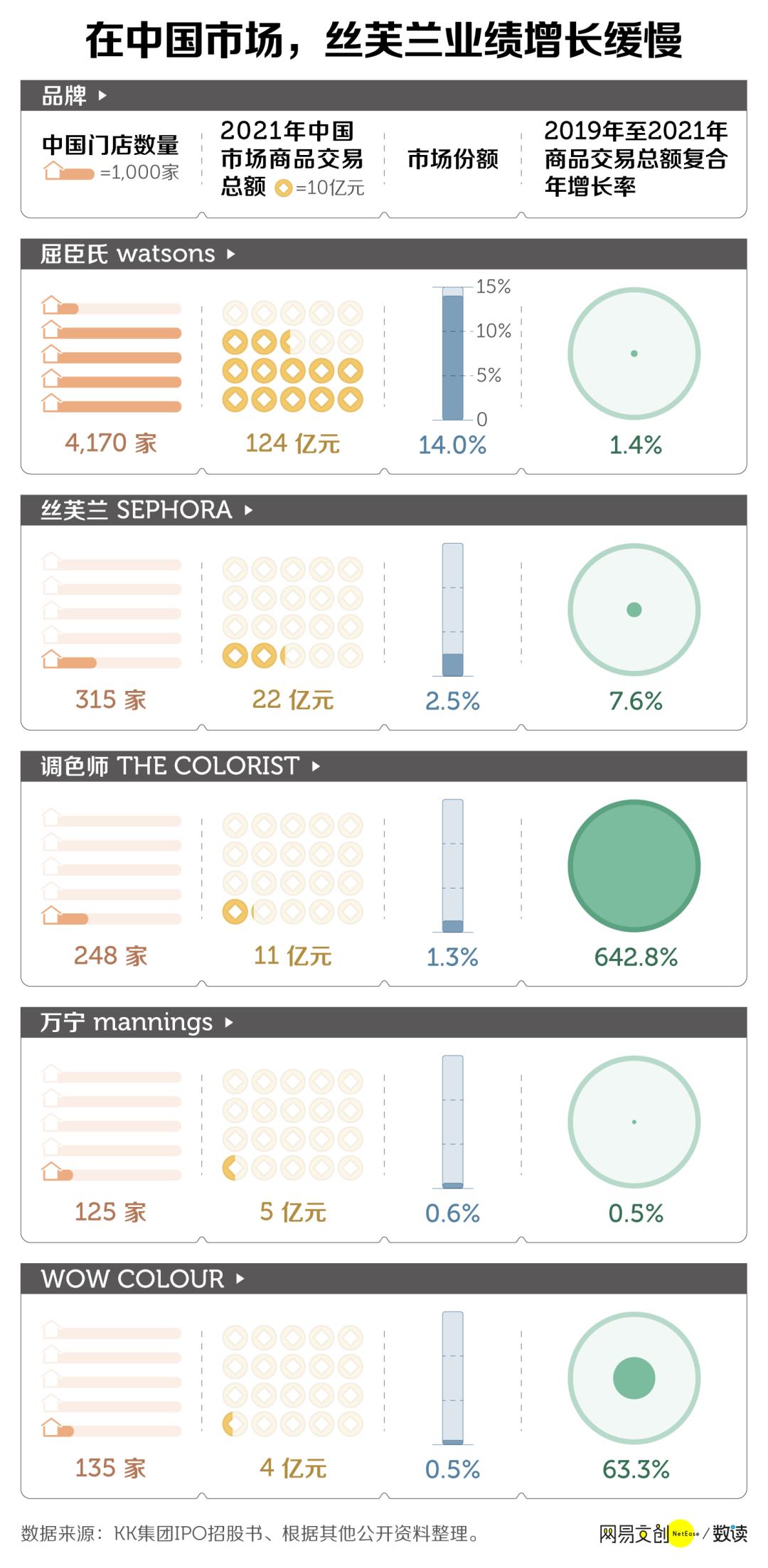 美妆集合品牌调色师所属的 KK 集团曾向港交所提交了招股书,显示 2019-2021 年这三年间,在中国市场中,丝芙兰的商品交易总额的复合年增长率仅有 7.6%。