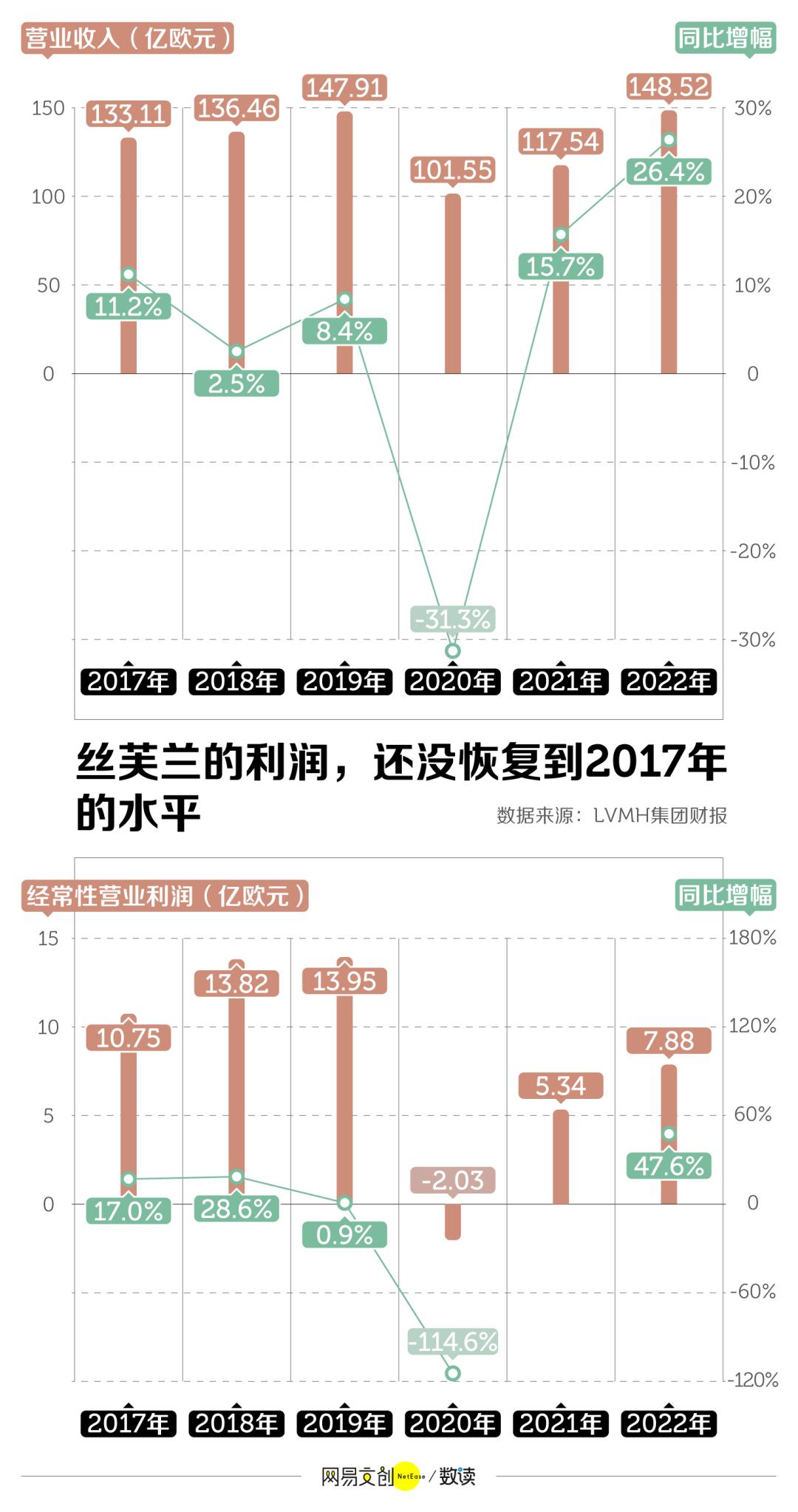 到 2022 年,丝芙兰的全年营收虽有好转,但实际赚到手的经常性营业利润只有 7.88 亿欧元,还比不上疫情前的水平,只达到 2017 年同期数据的约 70%。