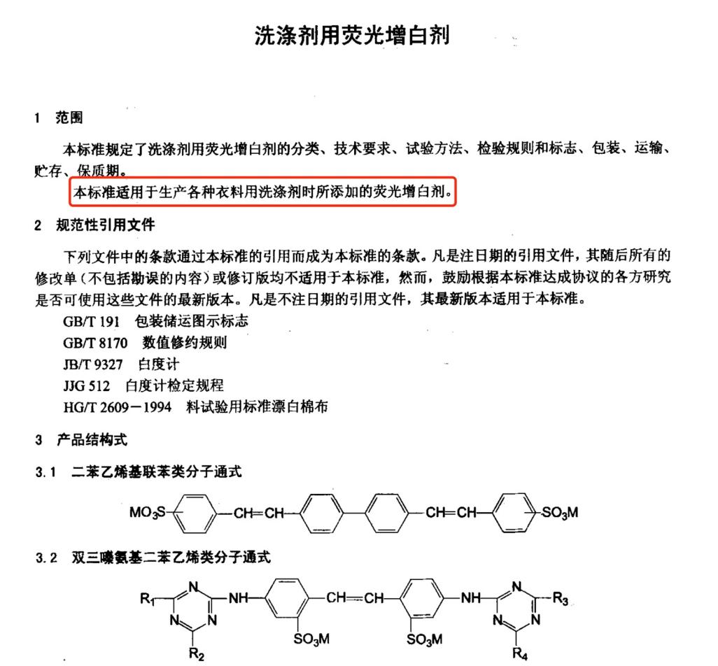 根据我国刚刚发布的新版关于洗涤剂用荧光增白剂的行业标准《洗涤剂用荧光增白剂》(QB/T2953-2008),“规定了洗涤剂用荧光增白剂的术语和定义、产品分类、要求、试验方法、检验规则和标志、包装、运输、贮存。本标准适用于各种衣料用洗涤剂配方中所添加的荧光增白剂。”