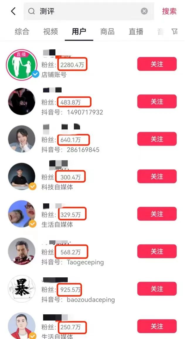 在短视频平台上搜索“测评”两字,可以看到有很多相关的专业博主,粉丝数量从200多万到2000多万不等,这也侧面说明市场产品测评的需求十分旺盛。