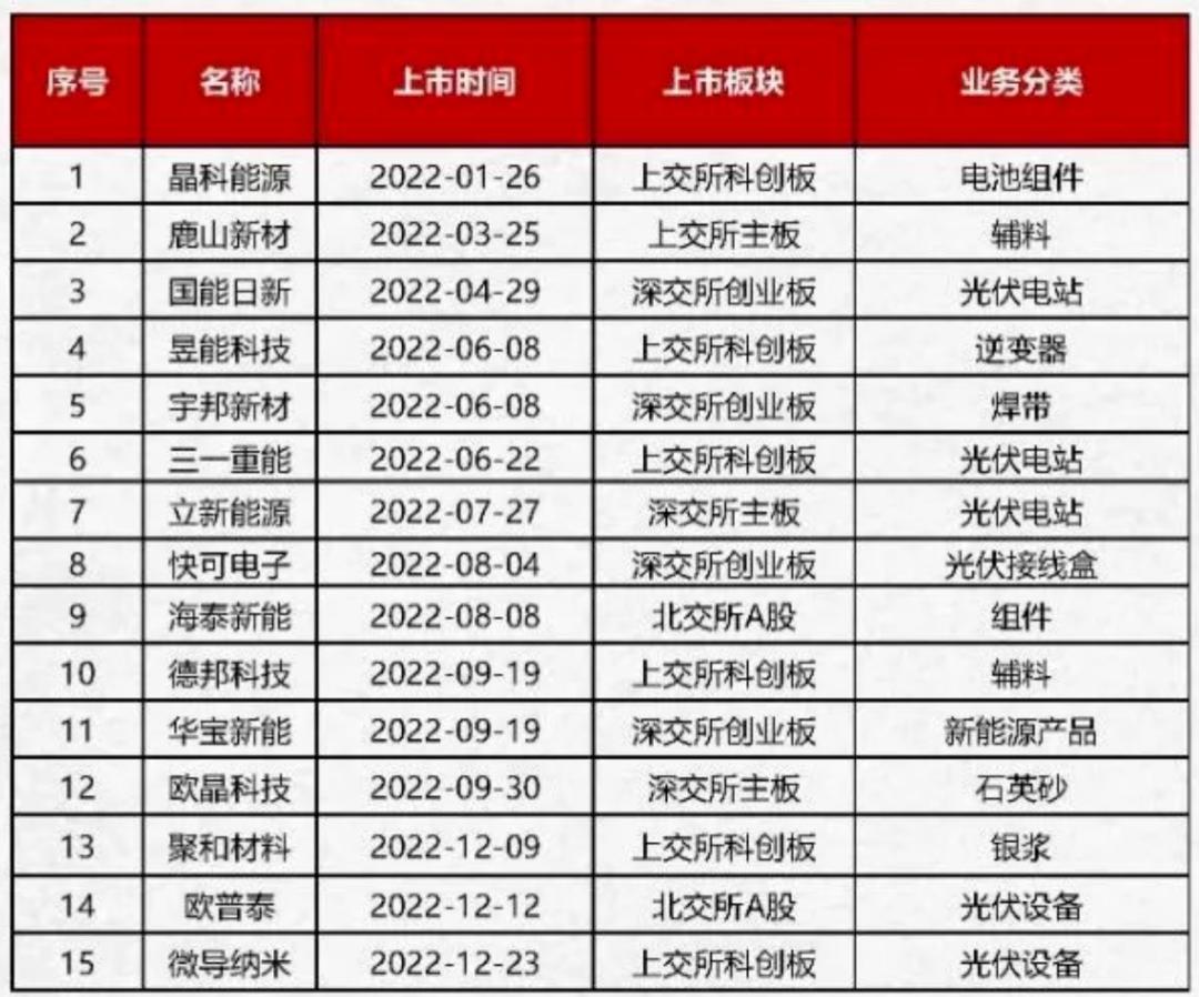 投资者对光伏产业看好,直接表现在光伏相关企业上市的数量上,CPIA数据显示,在2022年国内就新增了15家上市公司,上市数量为近年之最。