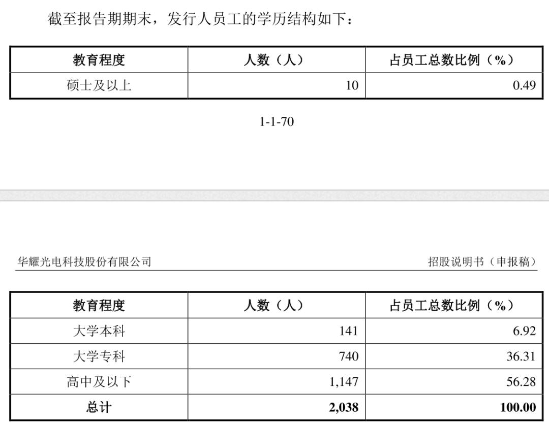 从招股书我们可以清楚地看到,华耀光电员工总数为2038人,其中研发人员仅为102人,占比仅有5%,甚至不如管理人员的113人多。而生产人员多达1797人,占比88.17%。从员工学历上看,本科人数仅占总人数的6.92%,专科、高中及高中以下学历的员工占总数的93.18%,作为一家科技企业,这样的人才结构让市场大跌眼镜。