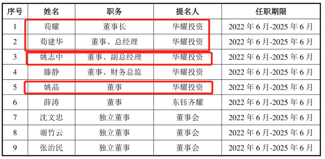 在核心董事会中,荀建华及其亲属占据6名非独立董事中的4席,是不折不扣的“一言堂”。从创立时间来看,2019年8月,仅仅是在荀建华清仓套现的第二年,华耀光电的注册资本也仅有2.37亿元,不足荀建华套现的零头。
