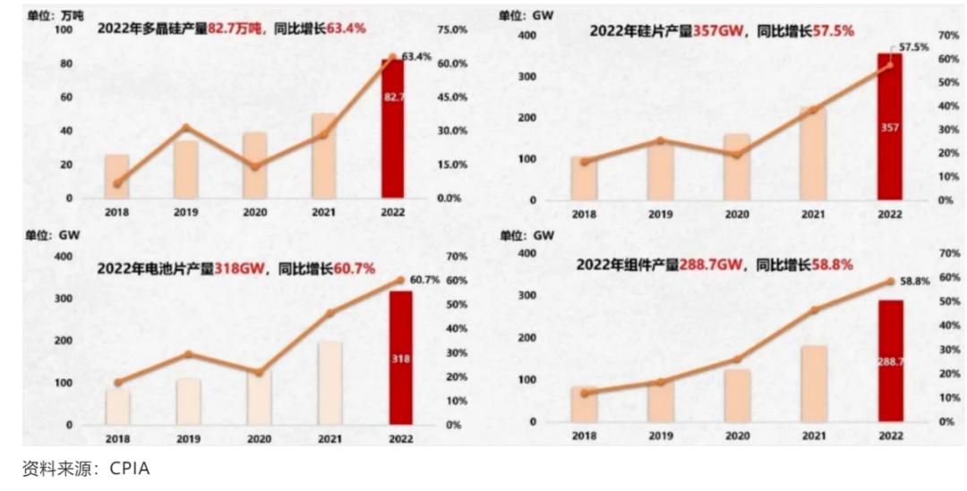 经过多年的摸索和发展,2022年,我国光伏制造端各环节均处于世界前列,具体数据为:多晶硅产量82.7万吨,同比增长63.4%;硅片产量357GW,同比增长57.5%;电池片产量318GW,同比增长60.7%;组件产量288.7GW,同比增长58.8%。光伏累计装机容量达392.61GW,同比增长28.07%位居世界第一。
