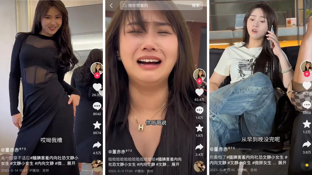 此外,我们还看到了记录逗趣日常生活的账号@董赤赤,其主人公是一个外表甜美文静,实则有一颗“硬汉心”、行事彪悍且不拘小节的东北美女董赤赤,围绕着外表给人带来的“错觉”,董赤赤身上发生了一系列让人忍俊不禁的搞笑段子,强烈的反差感和随之出现的内容转折不仅让董赤赤“表里不一”的形象深入人心,也构建出了账号的专属特色,让其得以收获了众多用户的喜爱。