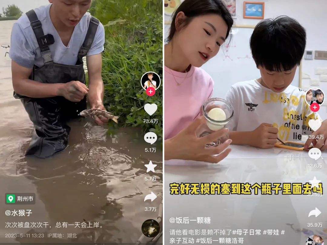 账号@饭后一颗糖 记录了母子二人斗智斗勇的生活日常,视频既有趣又温馨,得以在5月增粉218.8W。乡野博主@水猴子 专注于在户外池塘“逮鱼摸虾”,新奇好玩的场景勾起了众多都市用户的强烈兴趣,5月共增粉105.7W。
