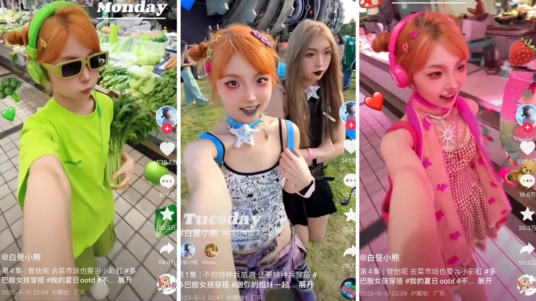 整体账号以新鲜面孔居多,比如将多巴胺穿搭带入大众视野的00后穿搭博主@白昼小熊不仅登顶小红书5月涨粉榜榜首,在抖音上也以272.8W的增粉量强势挤入涨粉榜TOP3,足见用户对这种用色大胆、明亮活泼、能给人极强视觉冲击力的穿搭方式的喜爱之情。