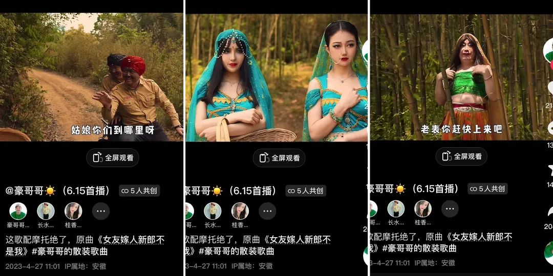 4月27日,@豪哥哥 发布了一条印度歌曲改编视频。视频中,他和同伴穿着印度风服装,骑着摩托走在乡间小路上,突然偶遇两个容貌秀丽的“印度”女子,在一句“姑娘你们到哪里呀,我的摩托车能带俩”的开场歌词中,一场印度风味浓郁的魔性改歌大戏就此拉开。豪哥哥和两位女子、以及中途从树林中钻出来的另一位“印度女子”密切配合,一边进行着歌曲的改编对唱,一边通过惟妙惟肖的表情、动作精彩演绎。整条视频中,歌词和曲调、情境完美契合,且虽然明明唱的都是中文,语调却像极了印度口音,有着明显的印度风情。