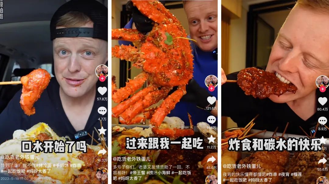 该账号之所以能够吸粉,一方面是因为达人根据粉丝的“点单”,在镜头前展现了多种多样的中国特色美食,且其大快朵颐的模样颇具代入感和沉浸感,能为用户带来一定的解压疗效;另一方面便是因为达人的身份和他所吃的食物有着强烈的反常感。视频中的铁蛋儿,明明是一个地道的老外,但不仅操着一口标准的普通话,还对各种中国美食了熟于心,这种外国人+中国胃的反差搭配不仅能够快速引起用户注意力,也让账号在吃播赛道中树立起了难以被复制的差异化特色。