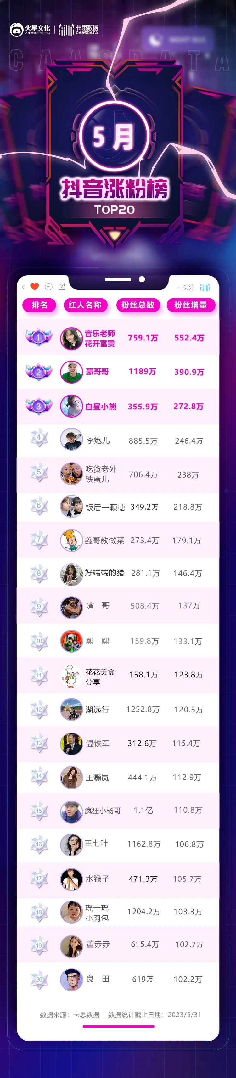 以上就是我们对5月抖音涨粉榜的分析。2023年即将过半,后续,涨粉榜是否还会带给我们新的惊喜?卡思将持续关注。