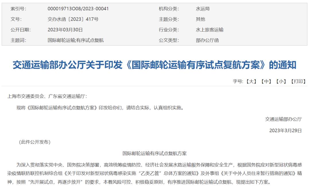 3月30日,交通运输部印发《国际邮轮运输有序试点复航方案》(以下简称《方案》)。《方案》提出,试点水路口岸先暂定上海、深圳邮轮港口,后续视情况增加。在试点时间方面,《方案》提出,暂定试点6个月至1年,根据国家疫情防控政策、出入境旅游政策和市场情况等适时优化调整。