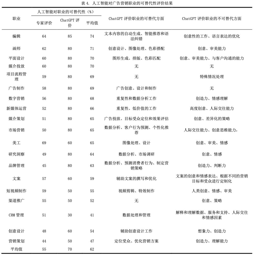 《研究》通过专家(60人,55%院校教师和45%营销从业人员)与人工智能(ChatGPT)双重评价体系,就「人工智能对广告营销行业职业技能的可替代性」进行系统化评价和量化分析。