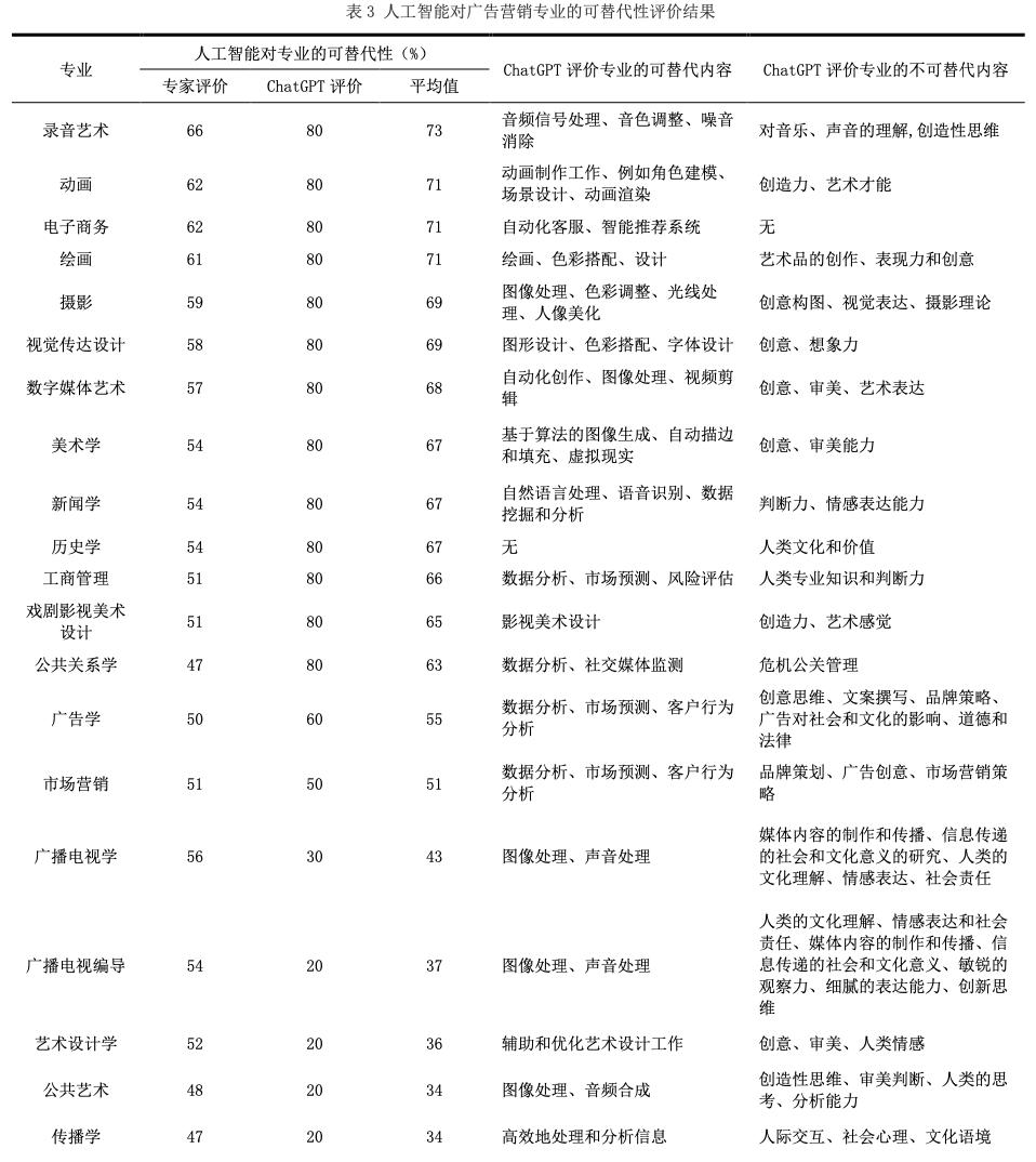 向上追溯到人才培养层面,包括工商管理、数字媒体艺术、电子商务等12个(共22个)广告营销相关专业的AI可替代性超过50%。