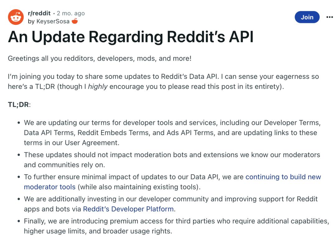 事情具体起因还要从两个月前,Reddit 官方致所有 redditor、开发者、版主的一封《关于Reddit API 更新》的公开信谈起。