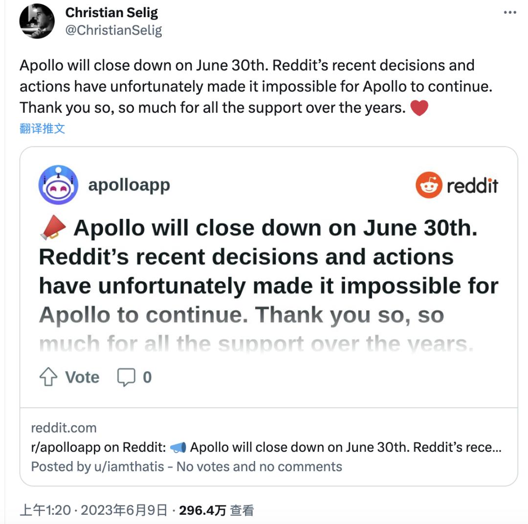 ”Apollo 将于 6 月 30 日关闭。不幸的是,Reddit 最近的决定和行动让 Apollo 无法继续下去。非常感谢大家多年来的支持。“