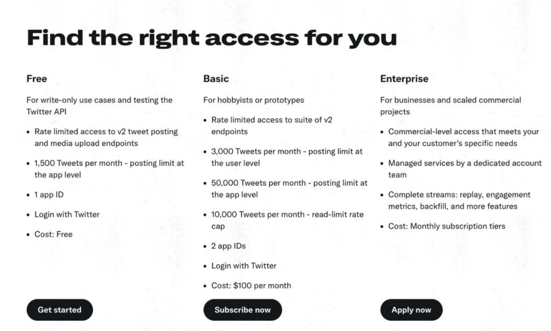 和 Reddit 一样有着收费决心的还有另一大社交平台 Twitter。今年 3 月,Twitter 推出了自家最新的 API 价格结构: