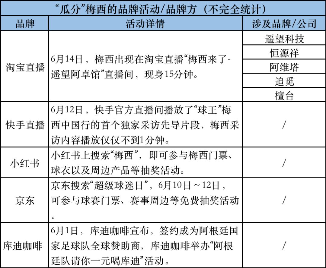 除了球赛的传统赞助之外,此次梅西中国行,淘宝直播、快手等社交平台也盯上了梅西。6月12日,淘宝直播和快手直播先后发布消息宣布梅西将在直播间亮相。12日晚,快手官方直播间直播了梅西专访的先导片,梅西出现1分钟;14日下午,梅西现身淘宝直播间,梅西出现15分钟。