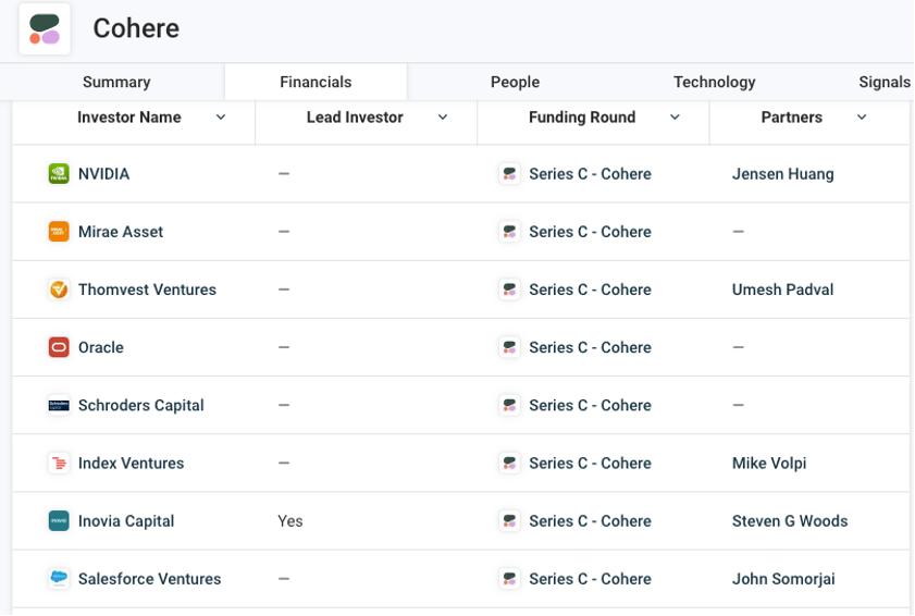英伟达、甲骨文和Salesforce都在押注Cohere,图片来自Crunchbase