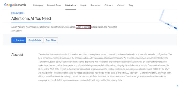 其中,Aidan Gomez在2017年本科期间就参与了由谷歌大脑团队研究并作为署名者之一发表了名为《Attention is All You Need》的论文,而这篇论文就是日后大名鼎鼎的Transformer机器学习架构的开端,也是发展谷歌BERT、OpenAI的GPT 等未来革命性架构的基石。