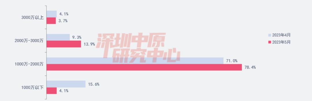深圳中原地产研究院数据显示,2023年5月深圳超千万的豪宅累计成交284套,主要分布在南山、福田和宝安三个区,其中1000万-2000万元的豪宅成交最受欢迎,占比达78.4%。