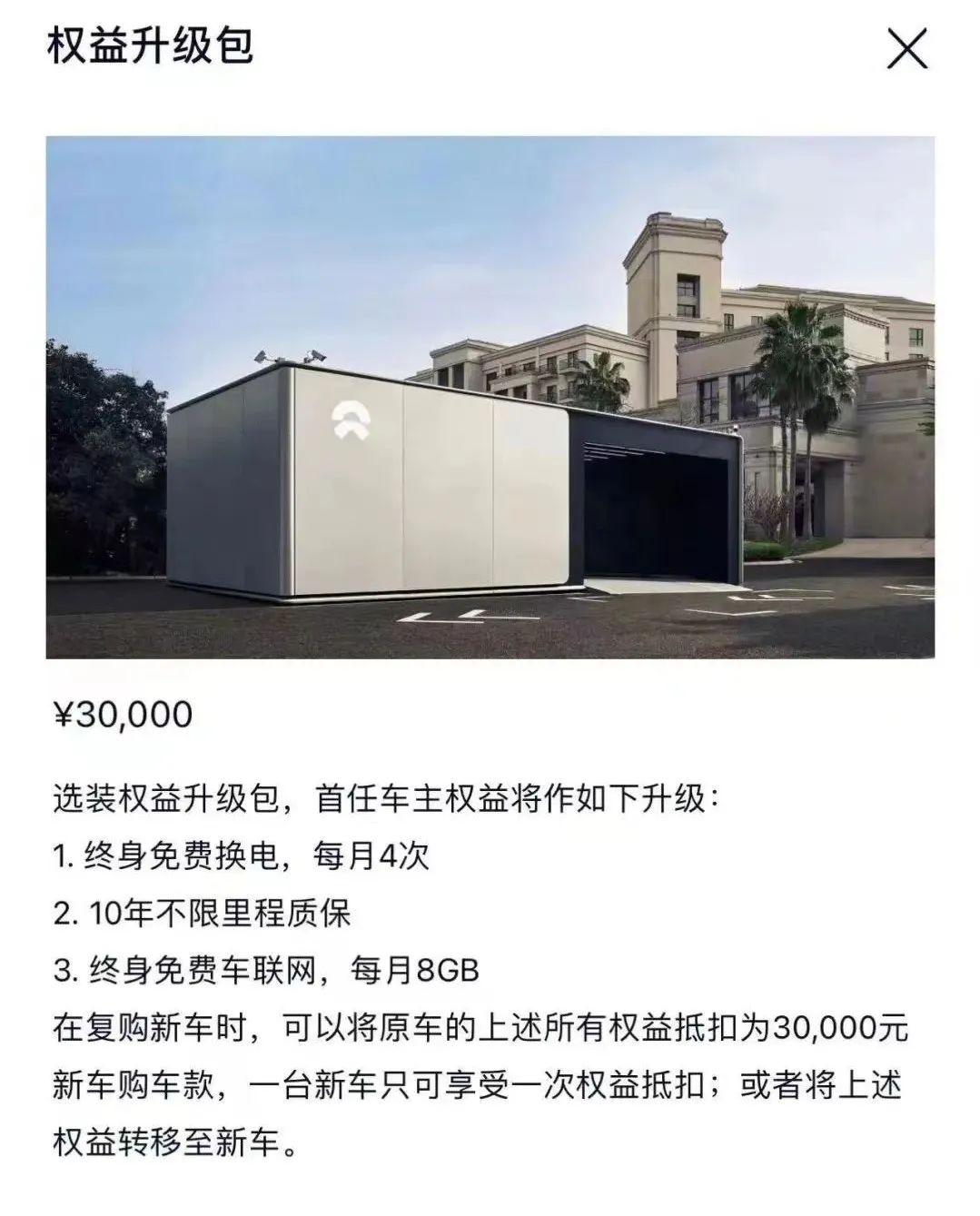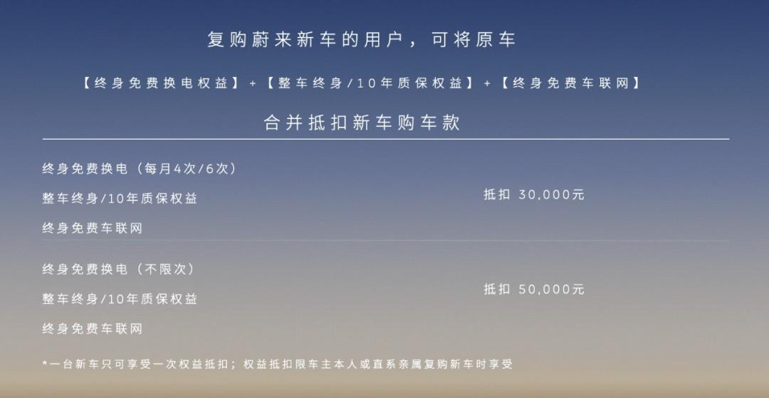 一个是权益转移。老车主在复购新车时,可以把原车上的权益转移到新车上,包括质保、免费换电、电池6折升级等,还包括早期用户的异地加电权益。这些操作在蔚来App中就有简单直接的入口。一个是车款抵扣,针对不需要权益的用户,其中,每月限制次数的换电权益可以抵扣 30000 元购车款,终身不限次的换电权益,可以抵扣 50000 元购车款。