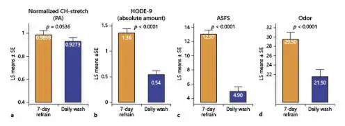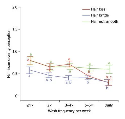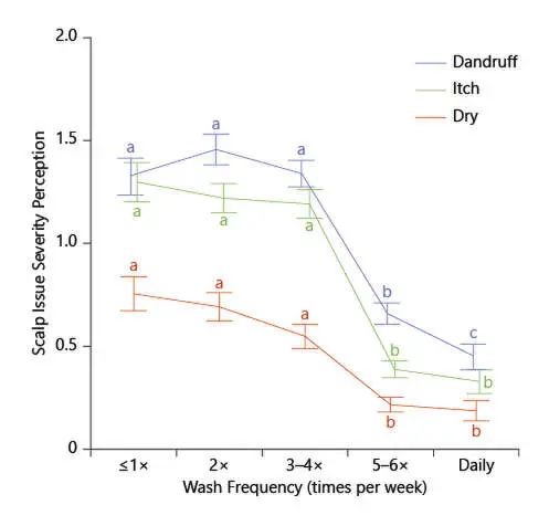 随着洗头频率的增加,自我感知的头皮屑、瘙痒和干燥的严重程度显着降低