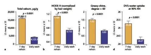 也就是说,相比 7 天不用洗发水的人相比,每天用洗发水洗头,头皮在不管是油脂、头屑、健康程度和气味的各个维度上都显著变好了。