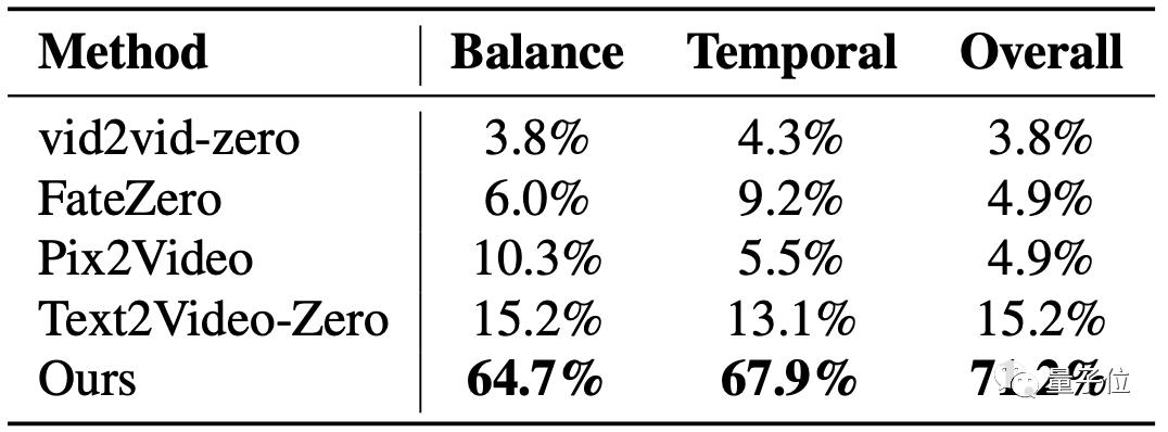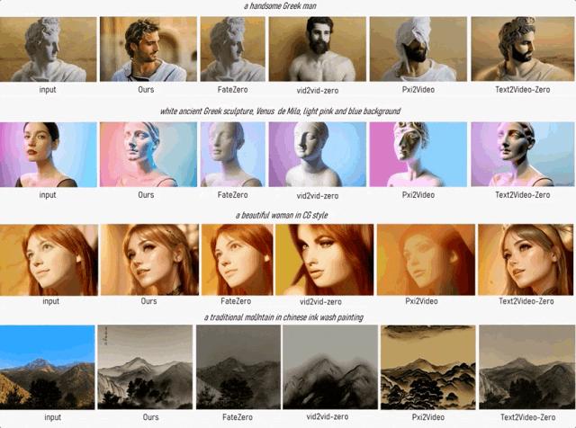 作者们将这个新框架和之前的几类文生视频框架进行了对比,包括FateZero、vid2vid-zero、Pxi2Video和Text2Video-Zero等,显然新框架目前是最流畅、鬼影也最少的: