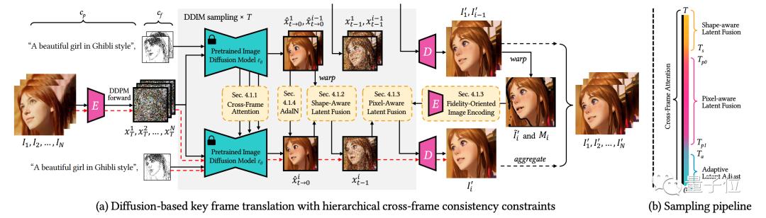 第一部分基于扩散模型生成关键帧,基于跨帧约束加强这些关键帧之间的一致性;第二部分则通过基于时间感知的匹配算法将其他帧与关键帧“连接”起来。