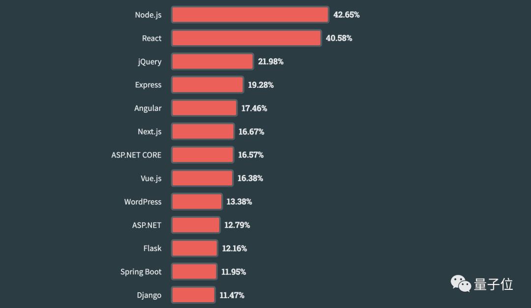 Web框架和技术中,前端的Node.js冲顶,React掉落第二,但问题不大,差距仅2%。Vue的排名又下降了一些。