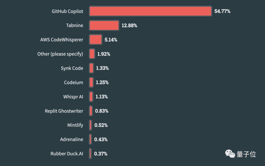 其次,作为AI开发工具,GitHub Copilot当之无愧NO.1,但使用人数为54.77%,和上面ChatGPT的盛况相比要弱一些。
