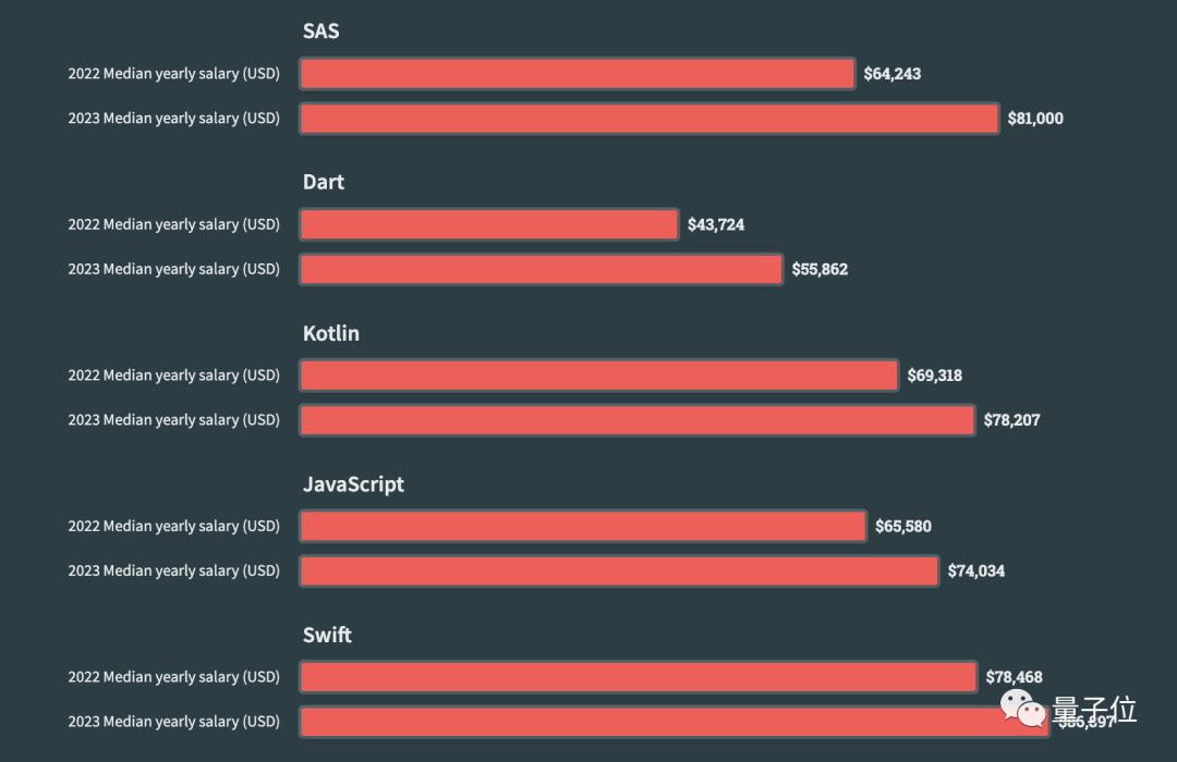 Dart和SAS这两门也值得关注,因为它是过去一年薪酬中值增幅最高的,同比增长超过20%。